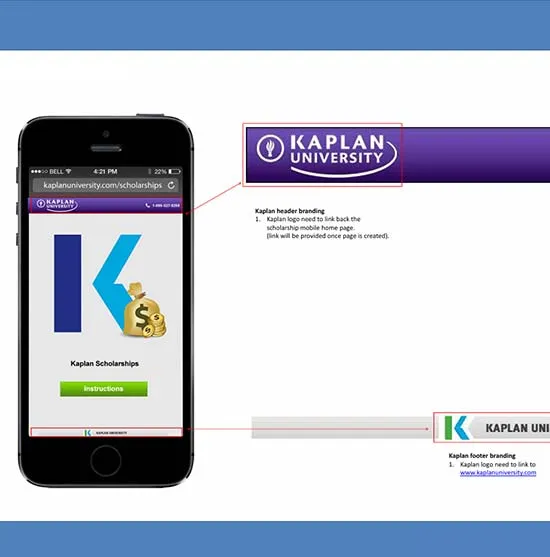 These samples present UX/UI Design Blueprints developed for Kaplan University, highlighting core practices focused on user research, usability, and thoughtful design. The blueprints demonstrate how users are guided through site widgets and mobile app experiences to efficiently navigate content and identify scholarship options best suited to their individual needs.